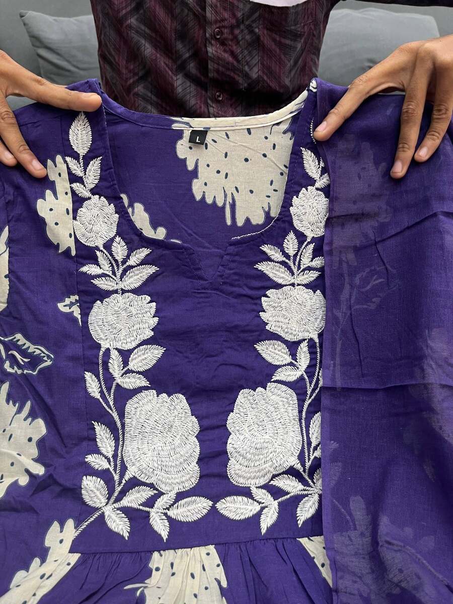 TRADITIONAL MUL COTTON PRINTED WITH WHITE FLORAL EMBROIDERY WORK TOP BOTTOM WITH DUPATTA PURPLE