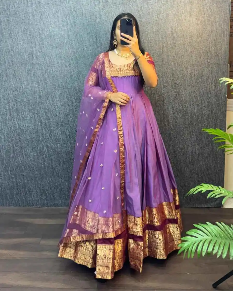 TRADITIONAL NARYANPET SILK BORDER WORK GOWN WITH NET DUPATTA PURPLE