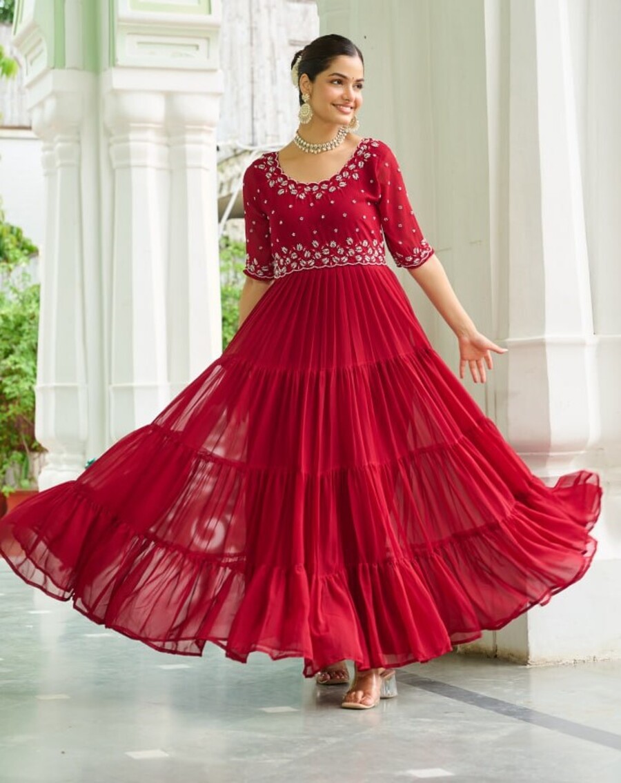 TRENDING BLOOMING GEORGETTE EMBROIDERY BEADS WORK GOWN RED