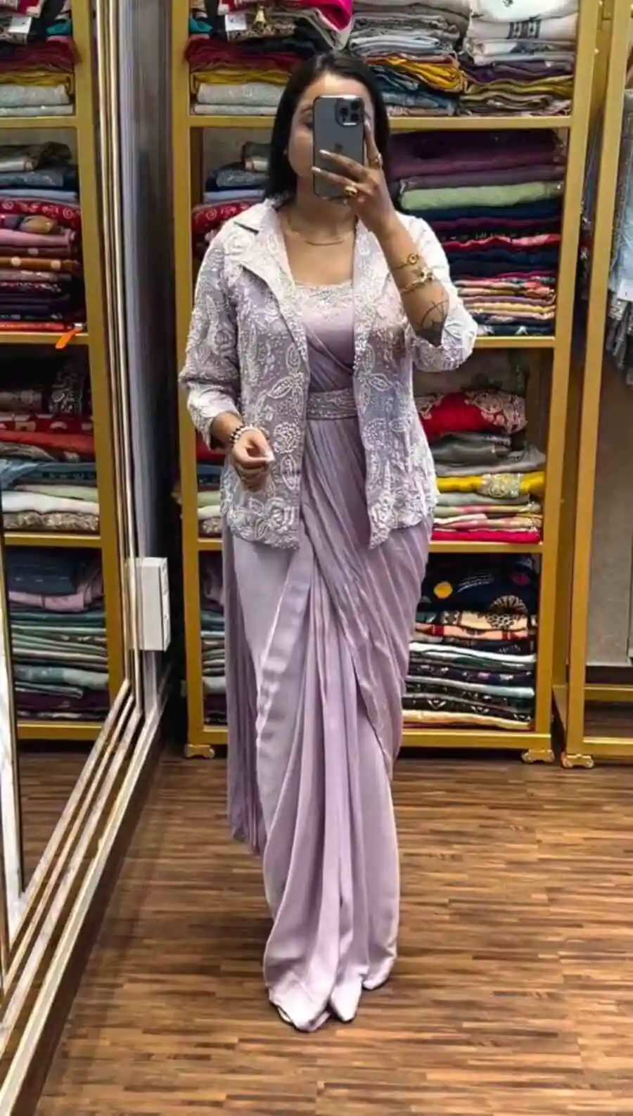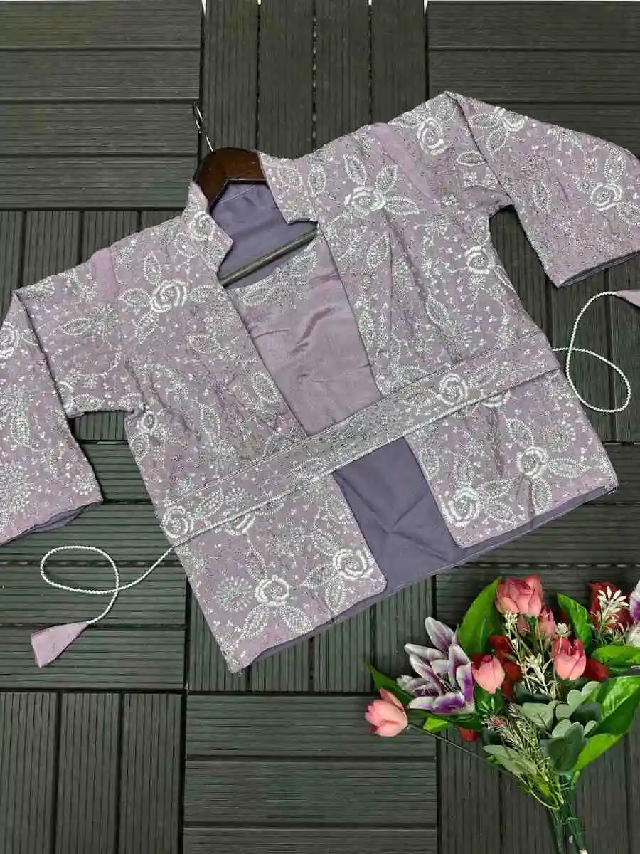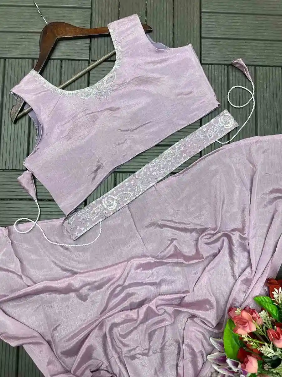 TRENDING CHINON EMBROIDERY SEQUENCE WORK READY TO WEAR SAREE STITCHED BLOUSE AND KOTI LAVENDER