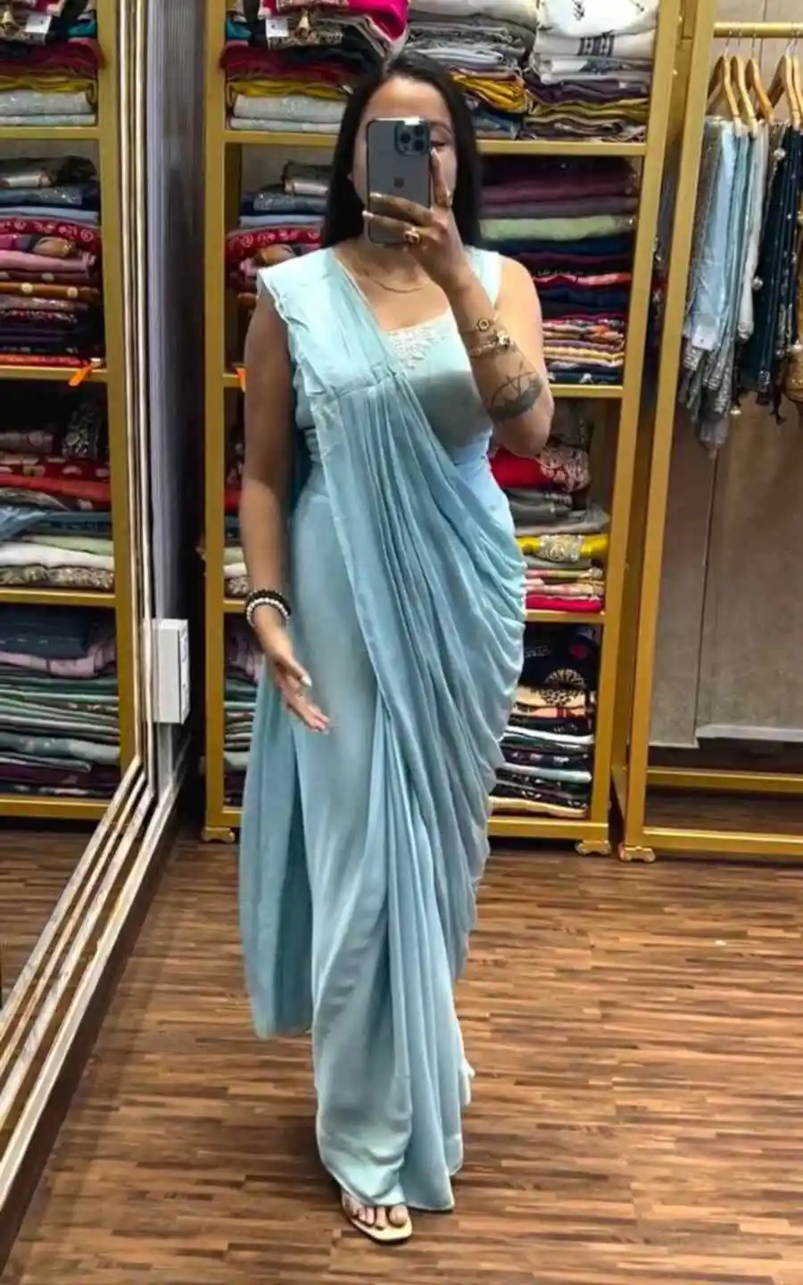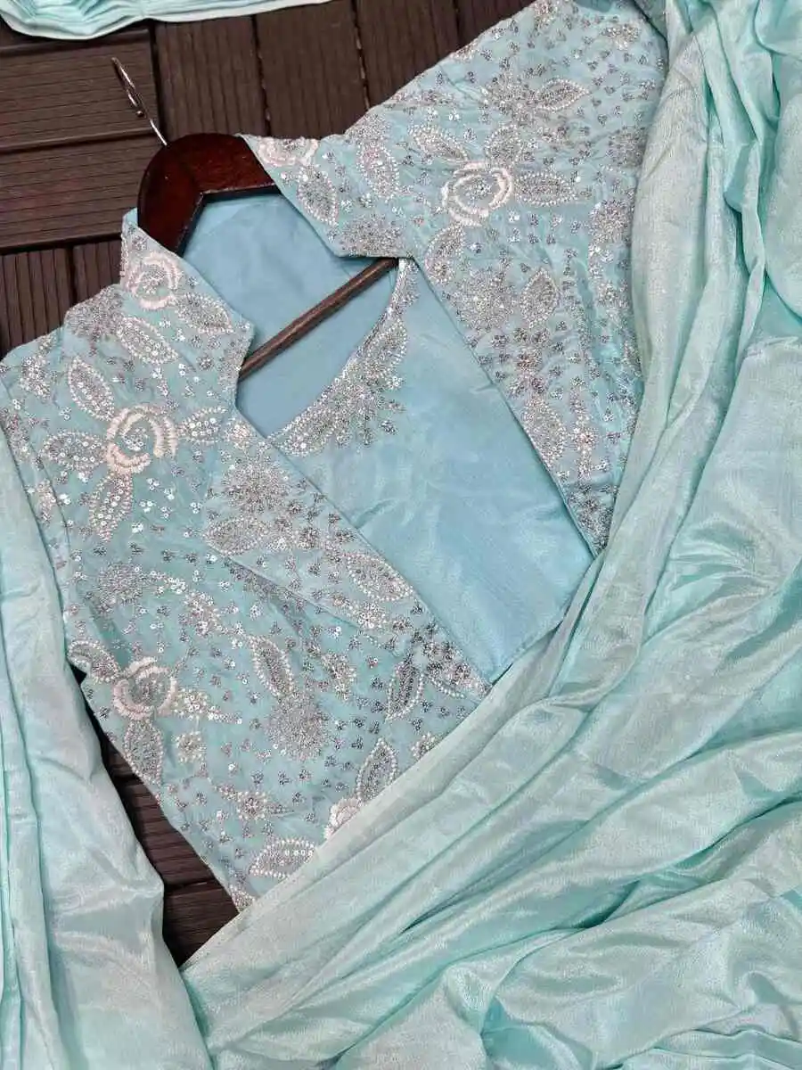 TRENDING CHINON EMBROIDERY SEQUENCE WORK READY TO WEAR SAREE STITCHED BLOUSE AND KOTI SKY