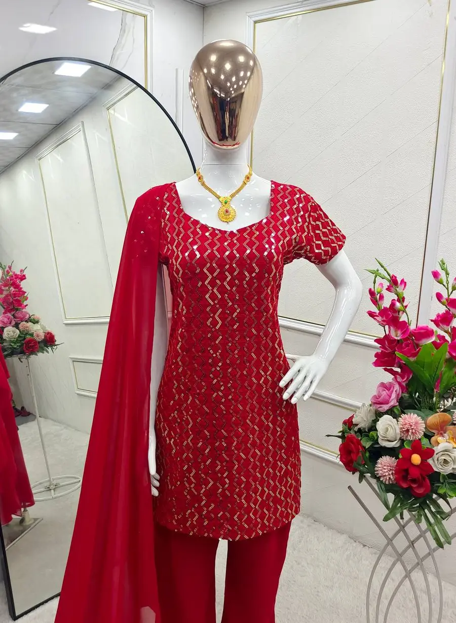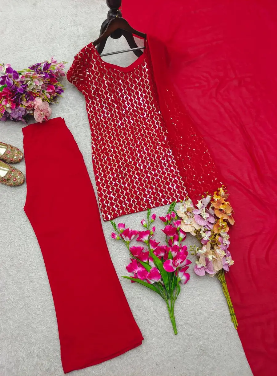 TRENDING GEORGETTE EMBROIDERY SEQUENCE WORK TOP PALAZZO WITH DUPATTA RED