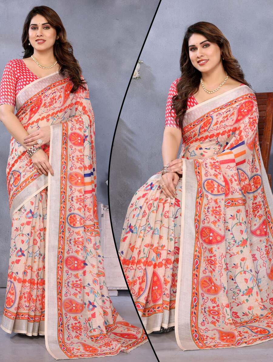 TRENDING HANDLOOM LINEN DIGITAL PRINT ZARI BORDER WORK SAREE WITH UNSTITCHED BLOUSE PEACH