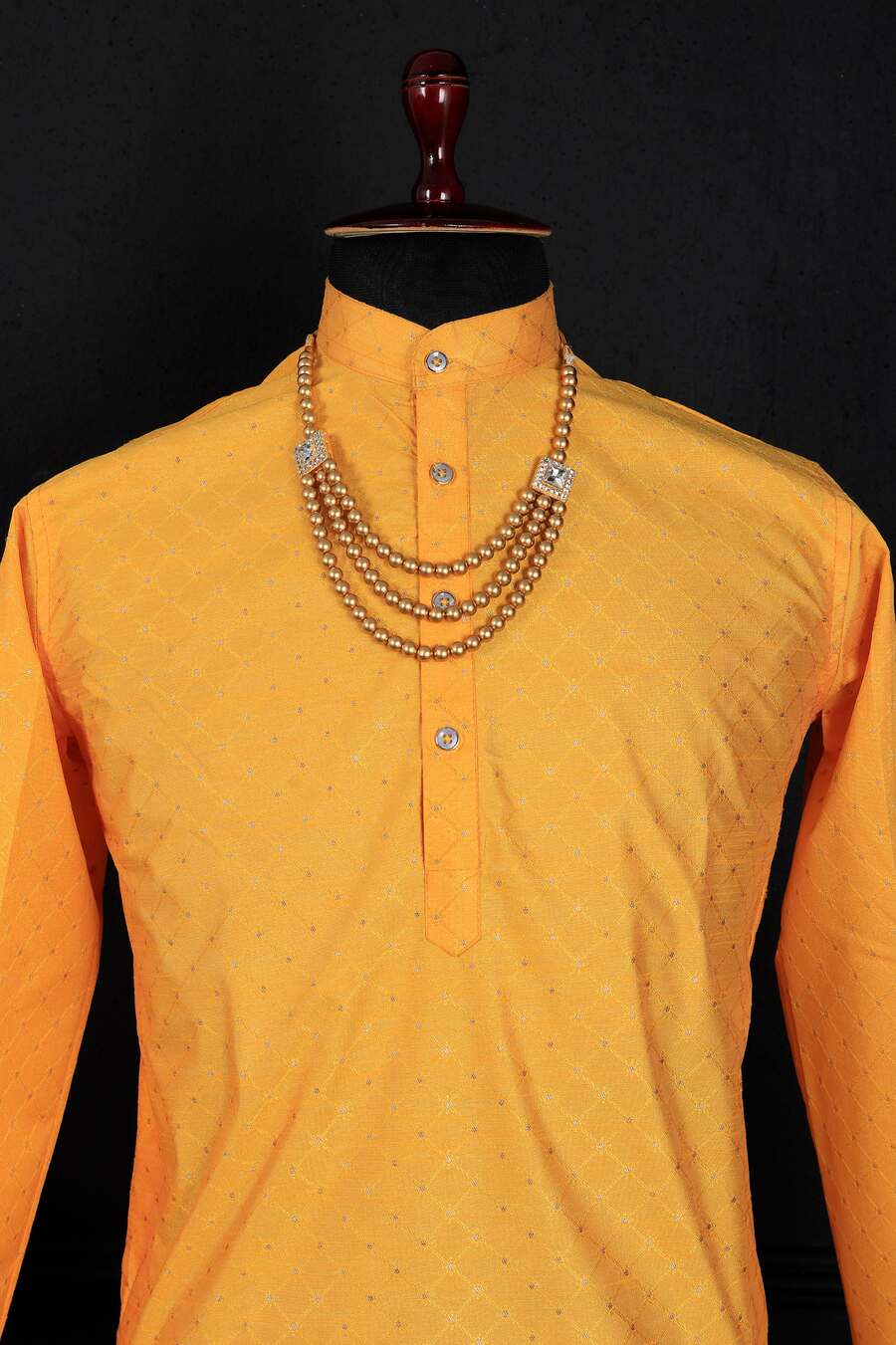TRENDING JACQUARD PRINTED WORK MEN’S KURTA PAYJAMA YELLOW
