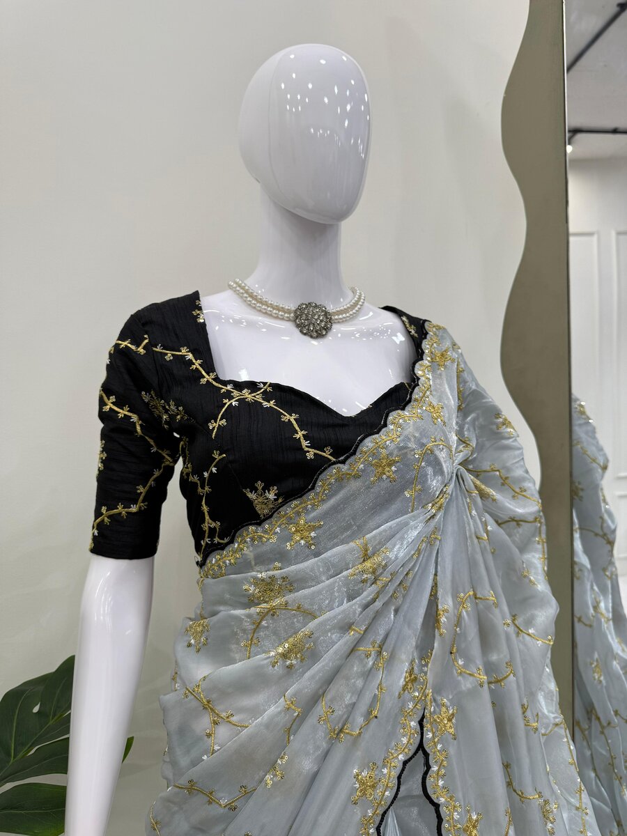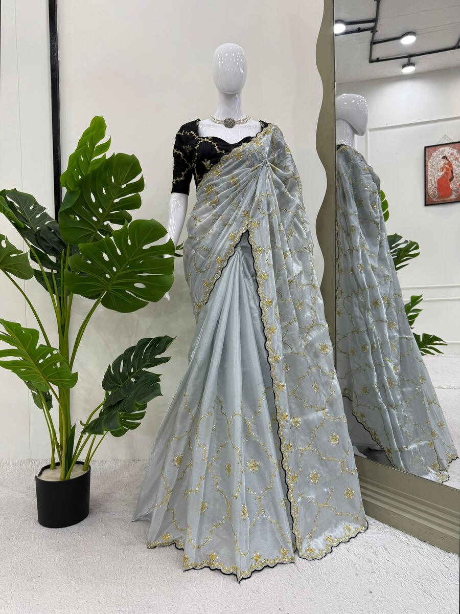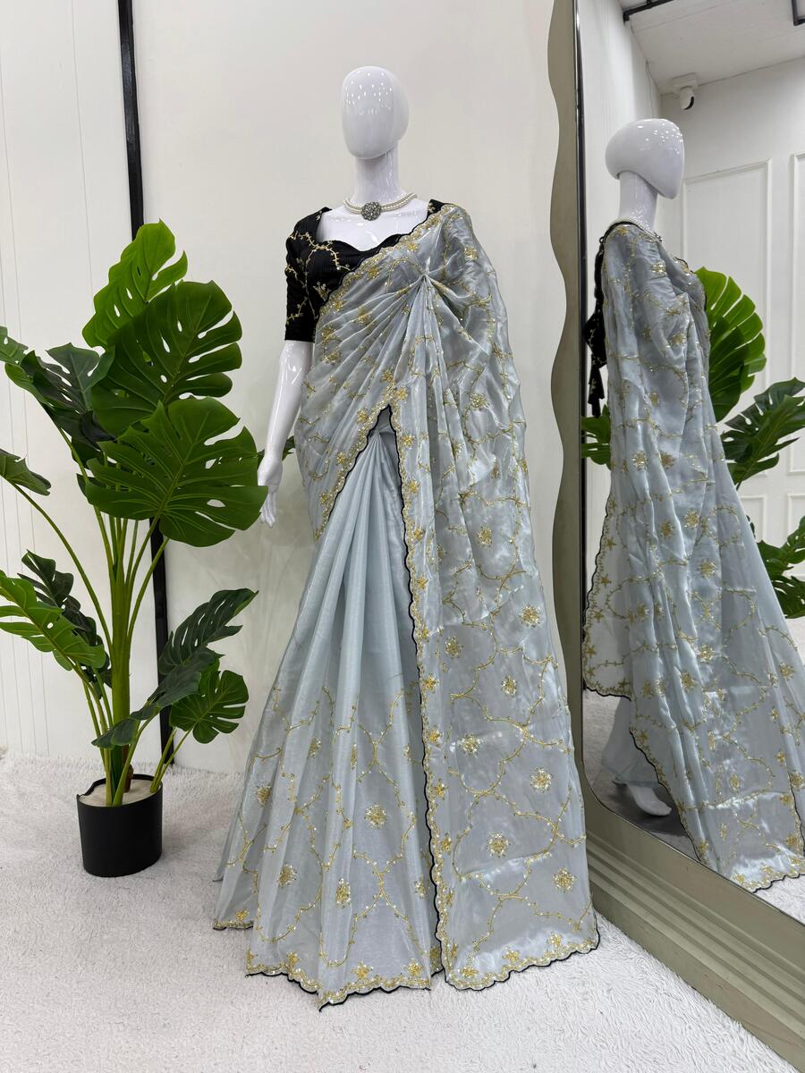 TRENDING JIMMY CHOO EMBROIDERY SEQUENCE WORK SAREE WITH UNSTITCHED BLOUSE GREY