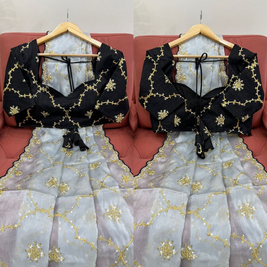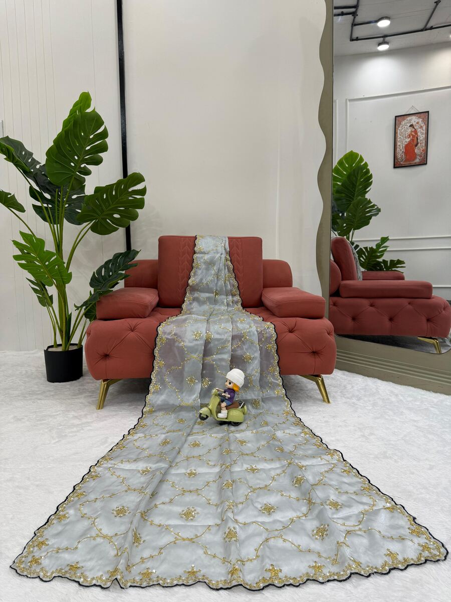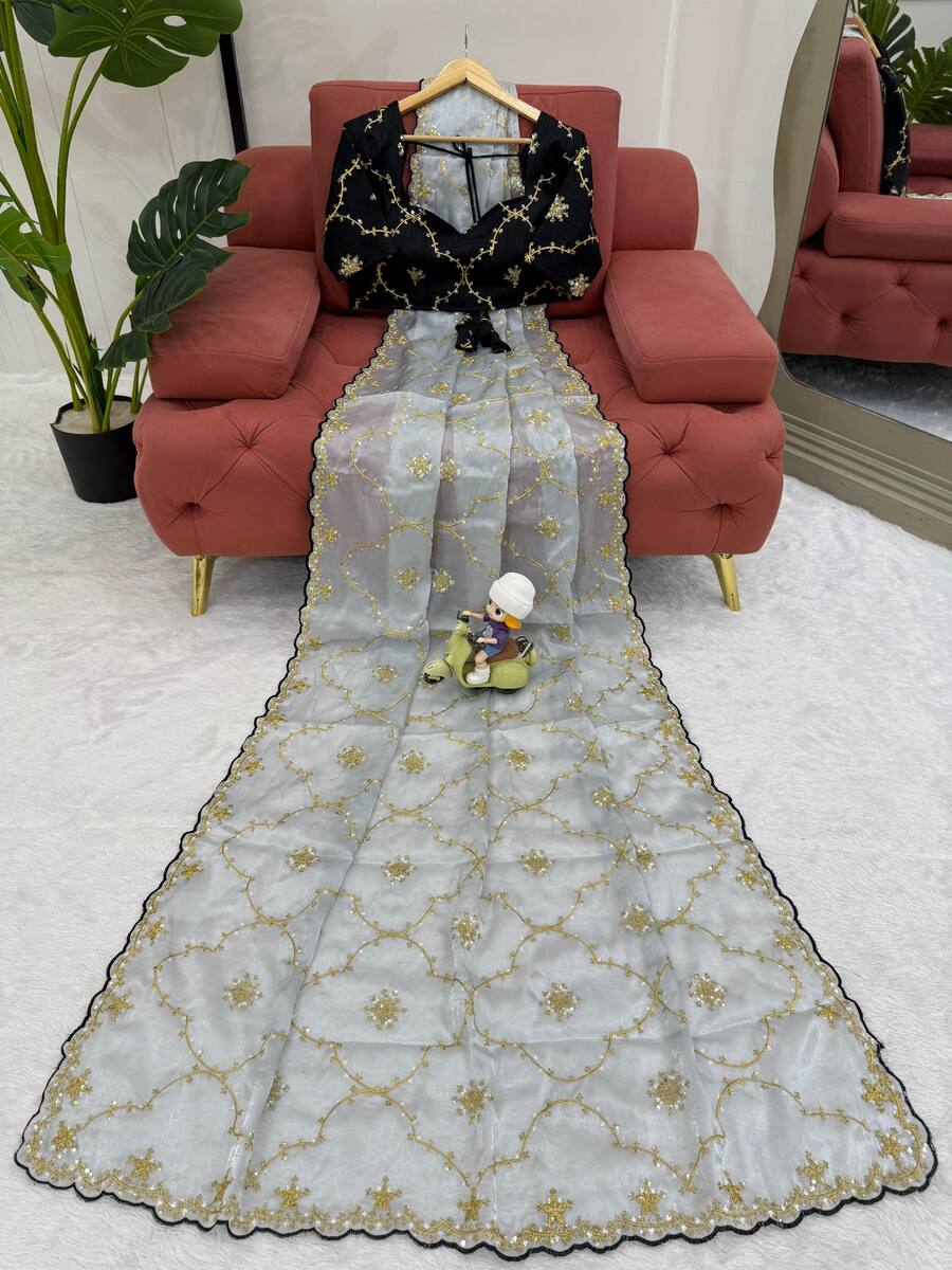 TRENDING JIMMY CHOO EMBROIDERY SEQUENCE WORK SAREE WITH UNSTITCHED BLOUSE GREY