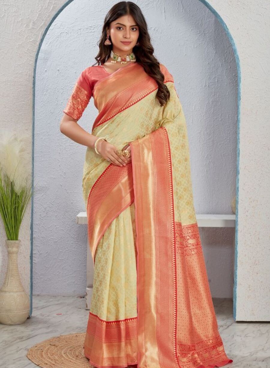 GOLDEN ZARI WEAVING JACQUARD SAREE WITH RICH PALLU AND BEAUTIFUL WEAVING BLOUSE