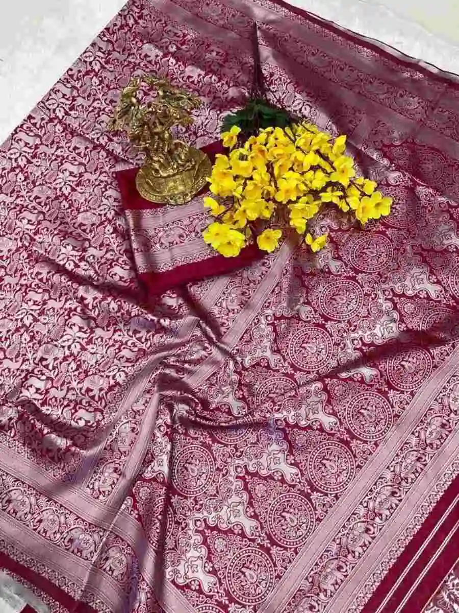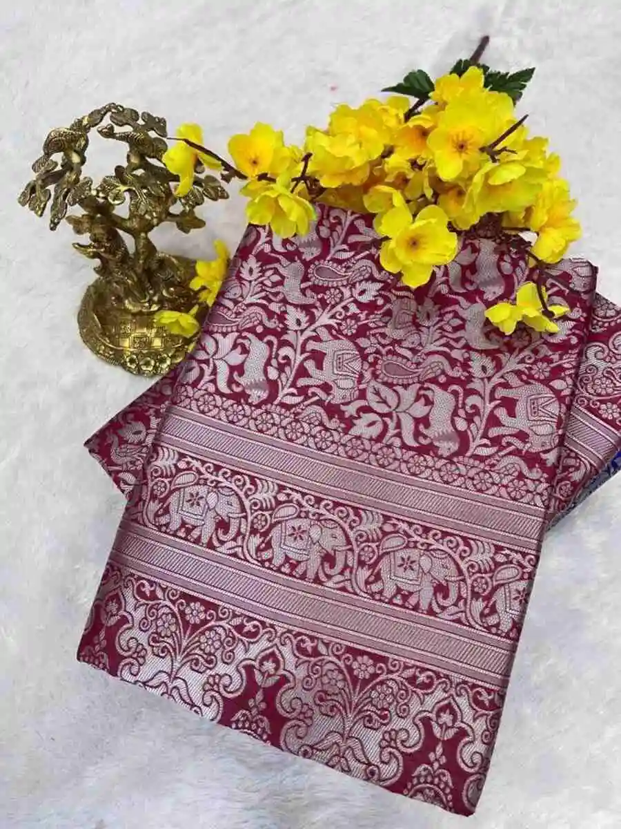 TRENDING LICHI SILK BANARASI WEAVING WORK SAREE WITH UNSTITCHED BLOUSE MAROON