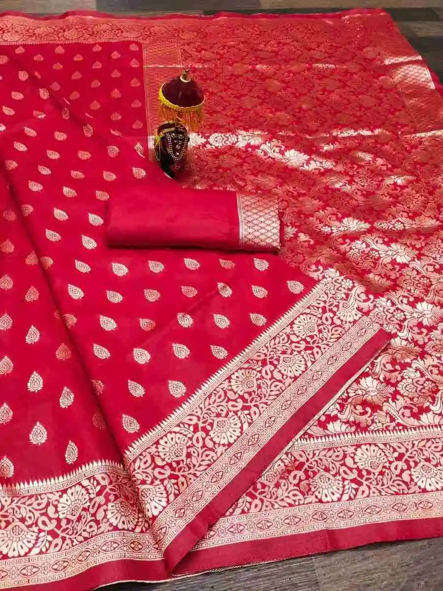 TRENDING LICHI SILK BANARASI WEAVING WORK SAREE WITH UNSTITCHED BLOUSE RED