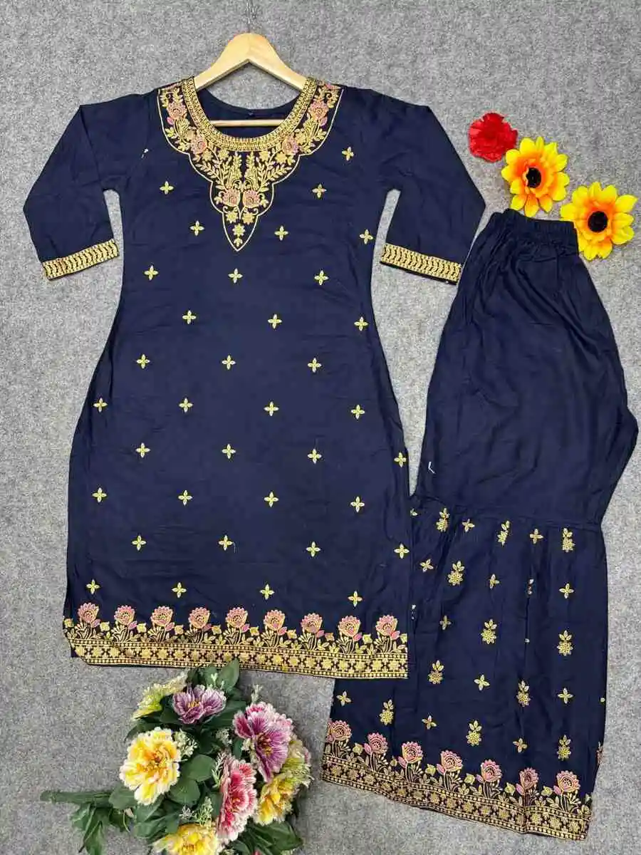 TRENDING RAYON FOIL PRINT WORK TOP AND SHARARA NAVY BLUE