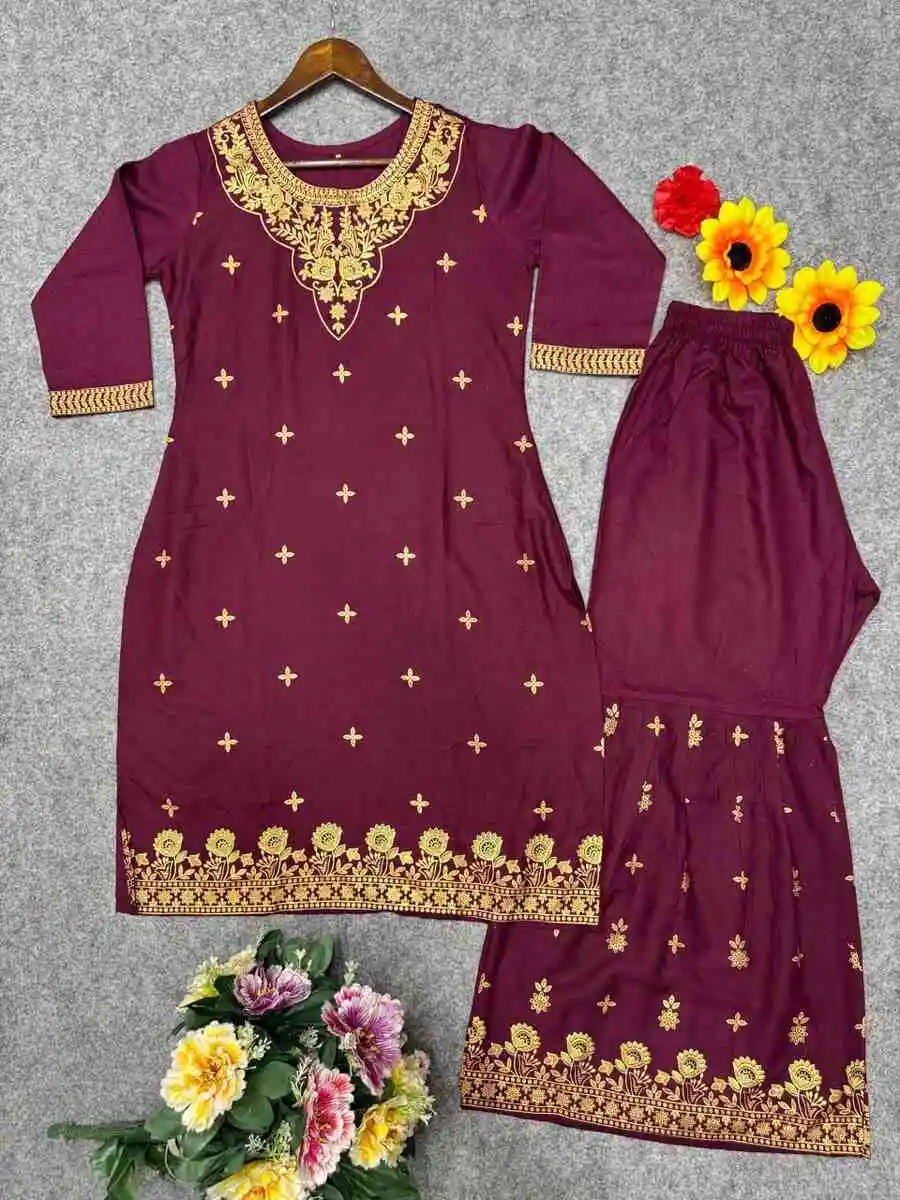 TRENDING RAYON FOIL PRINT WORK TOP AND SHARARA WINE