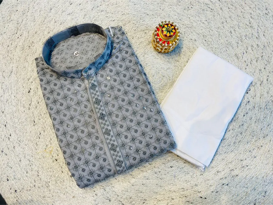 TRENDING RAYON SILK EMBROIDERY SEQUENCE WORK MEN’S KURTA PAYJAMA GREY