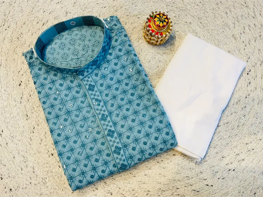 TRENDING RAYON SILK EMBROIDERY SEQUENCE WORK MEN’S KURTA PAYJAMA RAMA