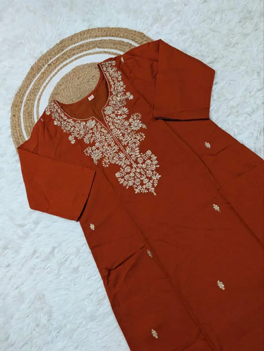 KURTI FABRIC :- 14KG REYON WITH EMBROIDERY DESIGN WORK FULL STITCH NAYRA PATTERN KURTI