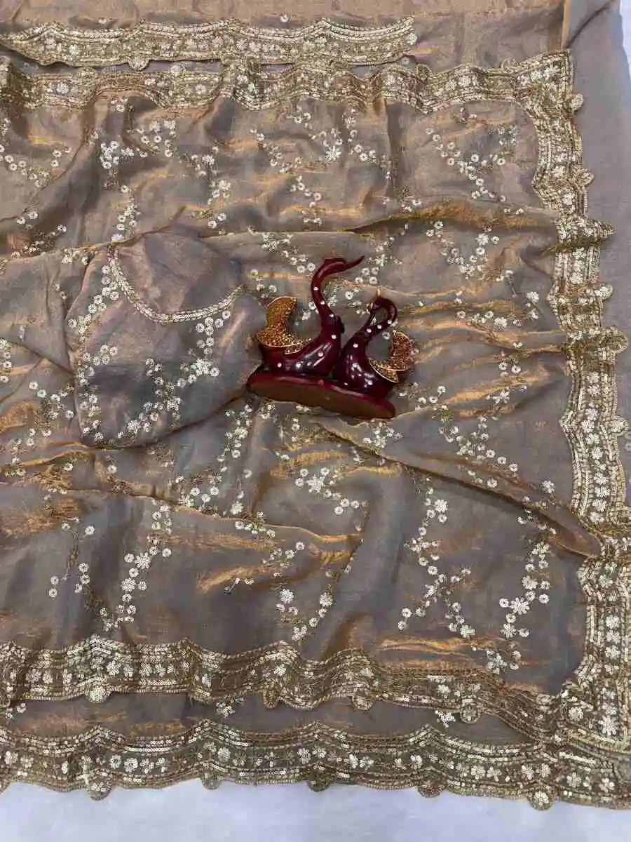 SAREE FABRIC : PURE SOFT TABBY ORGANZA WITH HEAVY EMBROIDERY MULTI TREADS , CODING & SEQUENCE WORK & FANCY CUT WORK BORDER