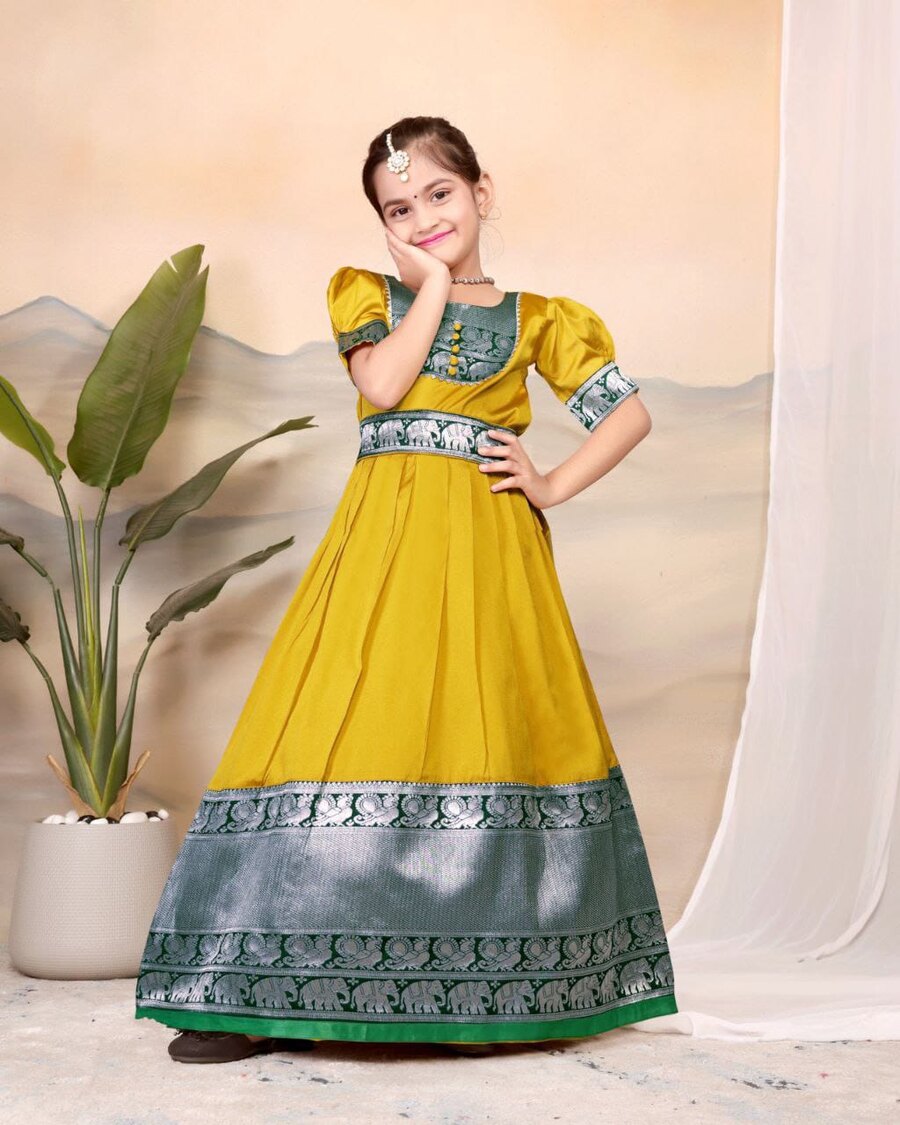 TRENDING TAFFETA SILK JACQUARD WORK KID’S TOP LEHENGA YELLOW