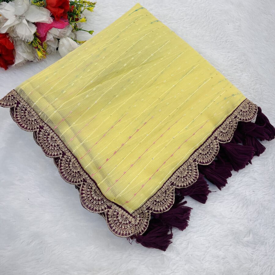 TRENDING TISSUE NET EMBROIDERY BORDER WORK SAREE WITH UNSTITCHED BLOUSE YELLOW