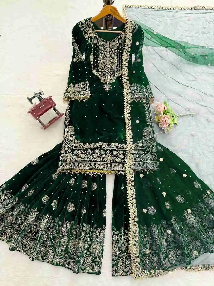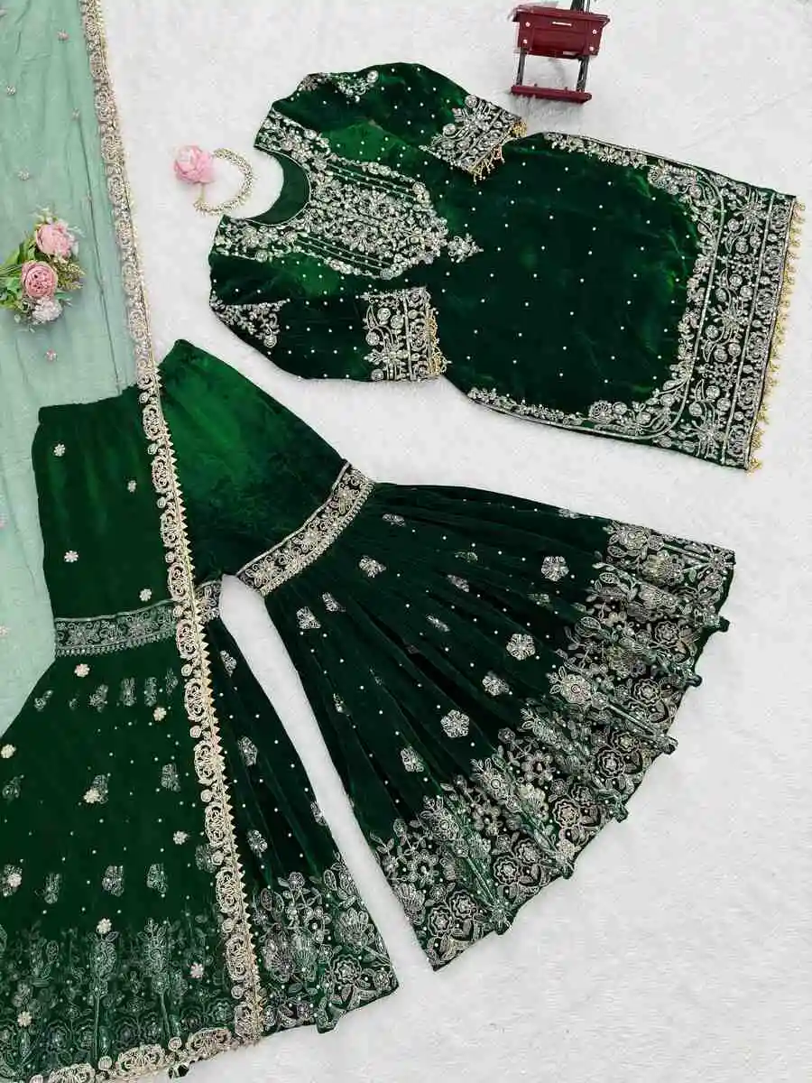 TRENDING VELVET CODING DORI EMBROIDERY WITH SEQUENCE & THREAD AND PEARL WORK TOP SHARARA WITH DUPATTA GREEN