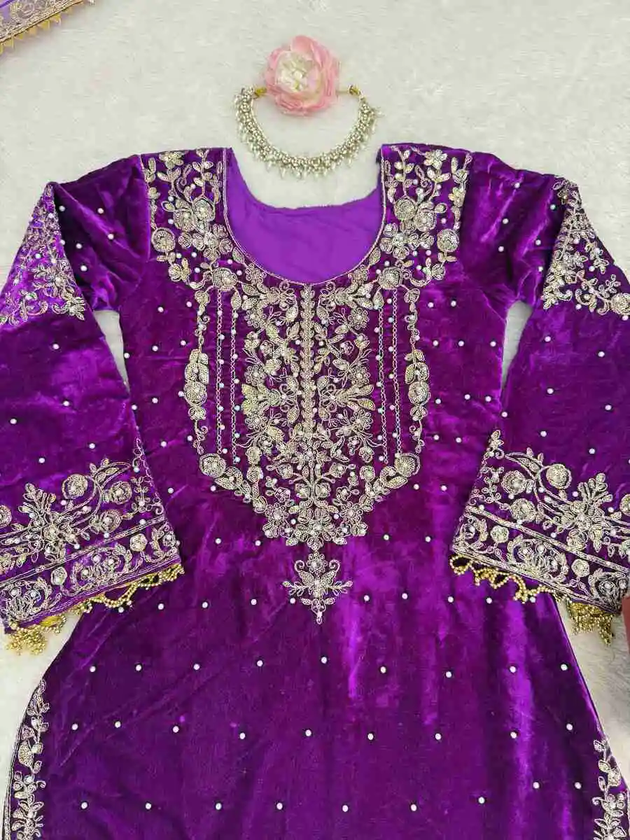 TRENDING VELVET CODING DORI EMBROIDERY WITH SEQUENCE & THREAD AND PEARL WORK TOP SHARARA WITH DUPATTA PURPLE