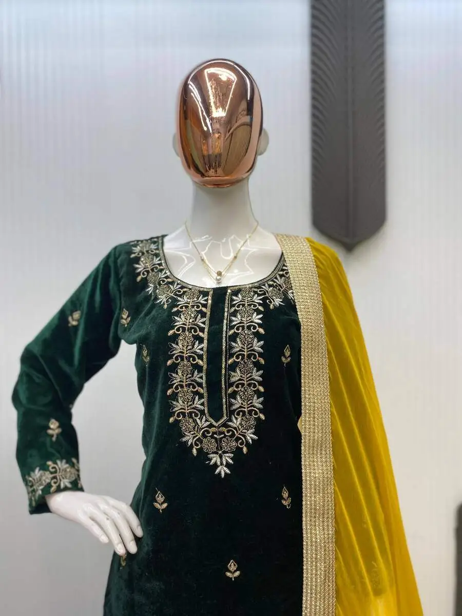 TRENDING VELVET SEQUENCE EMBROIDERY WORK WITH MOTI LACE WORK TOP PALAZZO WITH DUPATTA GREEN AND YELLOW
