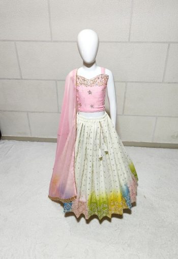 KID WEAR LEHENGA FABRIC :- FAUX GEORGETTE WHIT BEAUTIFUL MULTI-5 MM SEQUENCE EMBROIDERY WORK & BORDER DESIGN ON BLOOMING