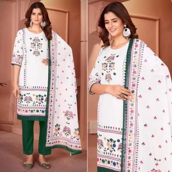 SIZE :- S TO 8XLSKU: 76340-2 - FESTIVAL WEAR MUSLIN PRINT WITH HANDWORK AND SEQUENCE WORK TOP BOTTOM WITH DUPATTA WHITE WITH GREEN ₹834.00