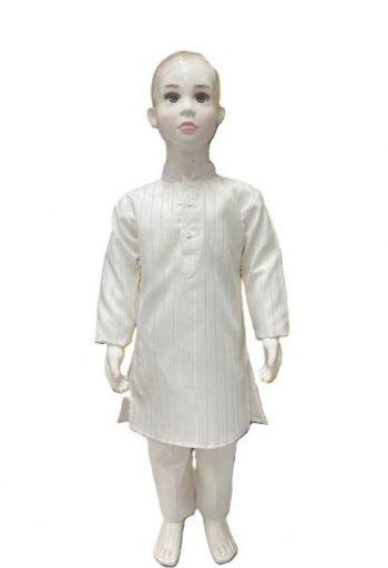 (REFER TO SIZE CHART)SKU: 66227-6 - TRADITIONAL COTTON SILVER WEAVING LINE KID’S WEAR KURTA WITH PAYJAMA WHITE ₹346.00