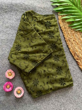OPEN :- BACK SIDE OPENSKU: 77348-1 - DESIGNER FENDY CHIFFON EMBROIDERY SEQUENCE AND THREAD WORK AND SCALLOP BORDER WORK SAREE WITH STITCHED BLOUSE MEHNDI ₹1,737.00