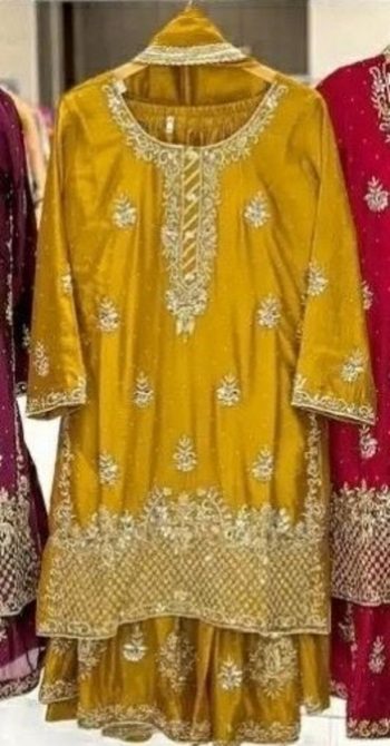 SAREE + UN-STITCHED BLOUSESKU: 78064-2 - NEW ARRIVAL CHINON SILK SEQUENCE EMBROIDERY WORK TOP SHARARA WITH DUPATTA YELLOW ₹1,597.00