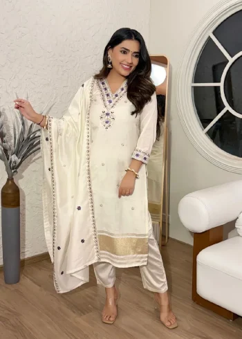 WORK : EMBROIDERY CODING DORI-SEQUENCE WORK WITH RIVET MOTI WORK AND LACE BORDERSKU: 80744-3 - TRENDING GEORGETTE EMBROIDERY SEQUENCE WORK TOP SHARARA WITH DUPATTA WHITE ₹1,666.00