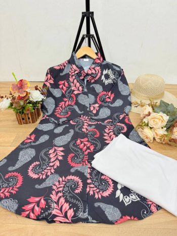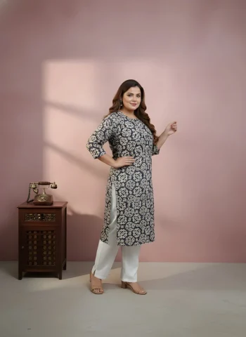 LENGTH : 2 METERSKU: 76215-10 - NEW ARRIVAL RAYON DIGITAL PRINT WORK KURTI WITH LYCRA PLAIN PALAZZO SET BLACK ₹485.00