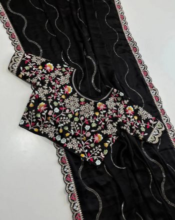 BLOUSE :- MAGGAM WORK READY MADE BLOUSE FREE SIZESKU: 72388-3 - DESIGNER RANGOLI SILK EMBROIDERY SEQUENCE WITH MULTI THREAD WORK AND CUT WORK BORDER SAREE WITH STITCHED BLOUSE BLACK ₹1,388.00